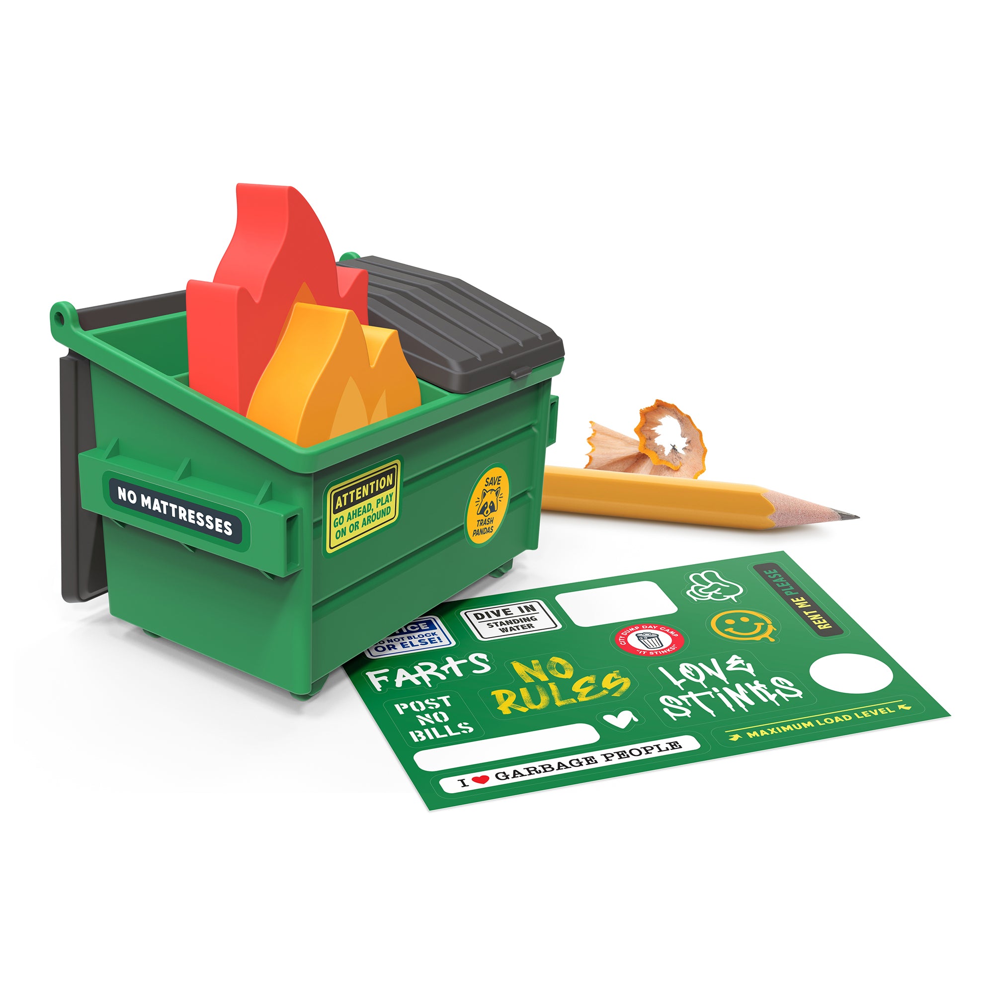 Fred’s Trash Talk is here to help clean up some of those throw-away ideas. This two-in-one dumpster desk set includes a 2.25” tall pencil sharpener that collects shavings in one half, and two flame-shaped erasers in the other. Each set comes with 15 edgy stickers to customize this trashy desk decor.